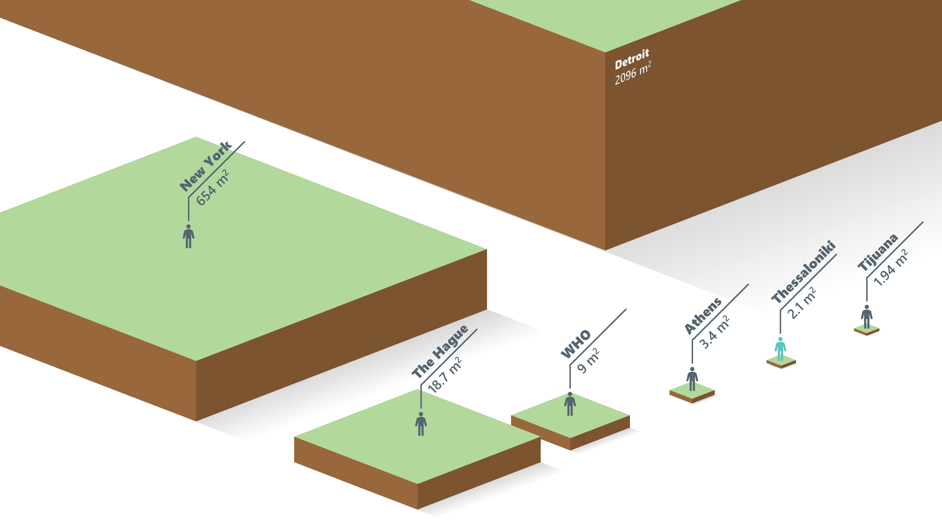 Thessaloniki has a shortage of traditional green spaces. Below, the city is compared to the World Health Organization (WHO) recommended minimum average green space per person along with other major cities. The lack of urban green spaces can be supplemented with vertical gardens in key areas. This website encapsulates research regarding a data driven approach to assessing the feasibility of vertical gardens in the area around Egnatia Street. Potential sites were also explored; each pin on the map represents a visited site. Click on a site pin for a picture of the location and a short description.