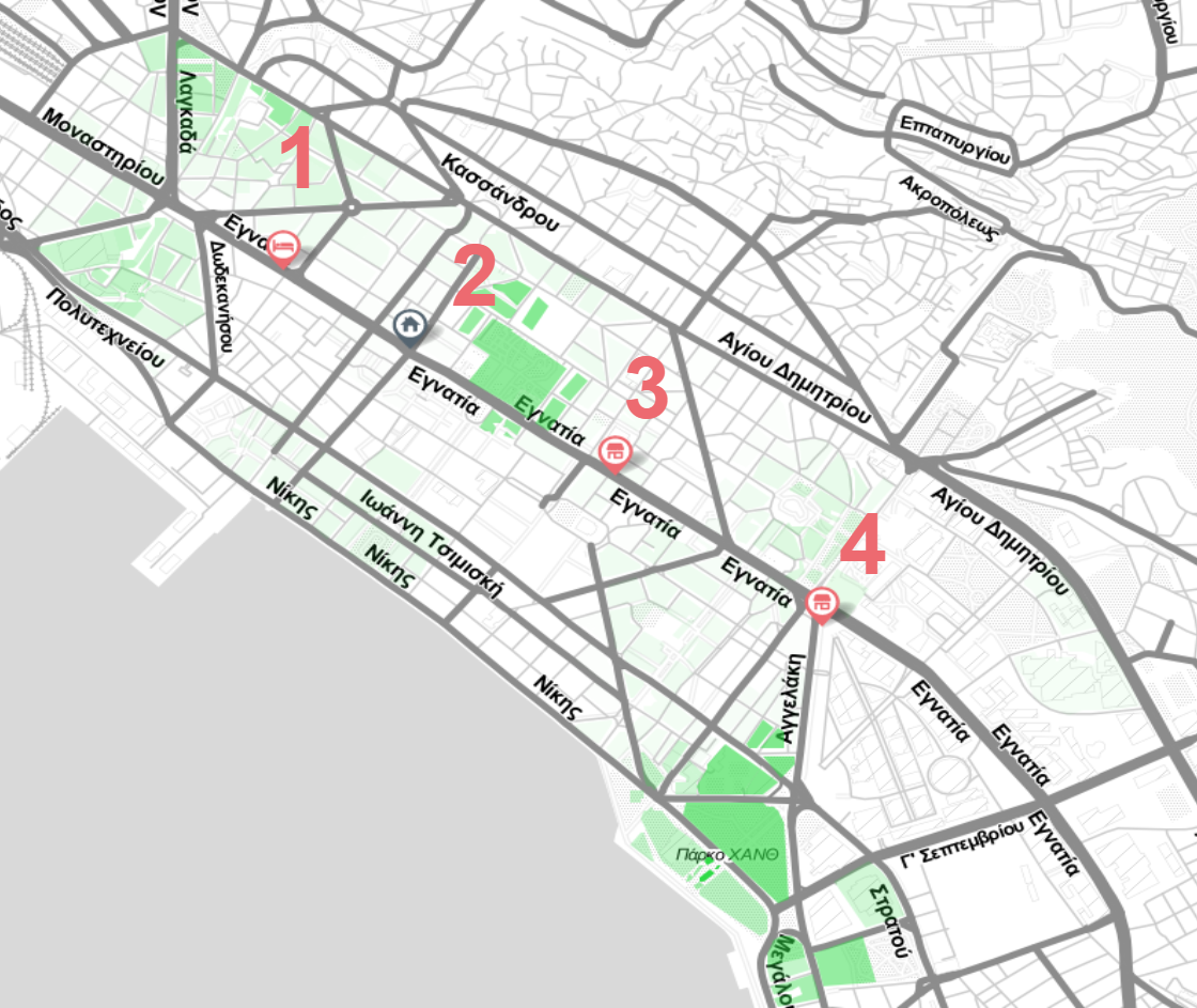 Four sites were selected to demonstrate potential implementation of vertical gardens into Thessaloniki. More information about each site and how it was selected as well as mock ups are shown below.