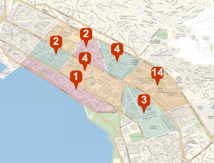 Relative Green Space: This layer started as a map of all building plots from The City of Thessaloniki. These plots were separated into two categories: green spaces and everything else. Every plot then had a set radius drawn around it. Every green space that had its center point in this circle had its area counted towards that plot's total. These totals were then turned into shades of green. White is the lowest concentration while bright green is the highest. This overlay shows the uneven and low concentration of green space around Egnatia Street.